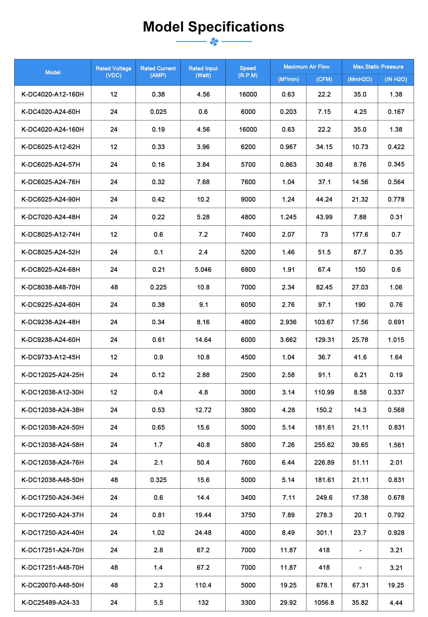 DC Axial Fans: Available in 5V, 12V, 24V, 48V.